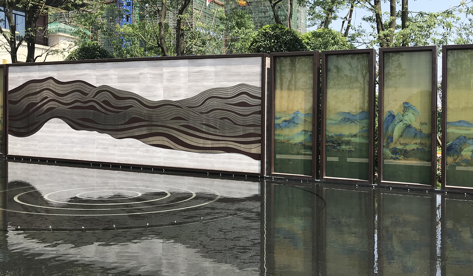 以真絲絹布打印青山綠水長軸,運用現代工藝,將絹畫夾在玻璃中間,中間景墻墻以高端法國木紋為背景,配合鋁板材質雕刻的山脈紋理,結合現代鏡面水景,利用朝夕的光影變化,仿佛古今交映,再現浩瀚江山壯美之境。