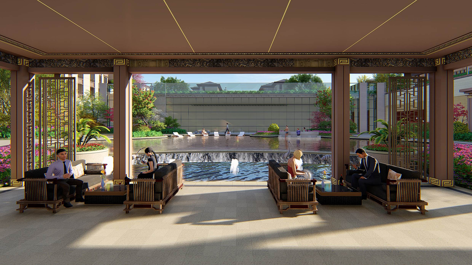 為屋頂花園營造“浮云之上,府院高堂”之意境,一層臺階,一層雍華,不畏浮云遮望眼,只緣身在最高層。屋頂之上四方美景盡收,強調空間與居者的氣度有容乃大,將屋頂有限空間放大到極致,所有豎向元素退至邊界,空間與天相呼應,因此陽光草坪設計為矩形,寓意天圓則地方,更加現代、雅致,將空間中心凸顯出來,營造極雅的空間意境。