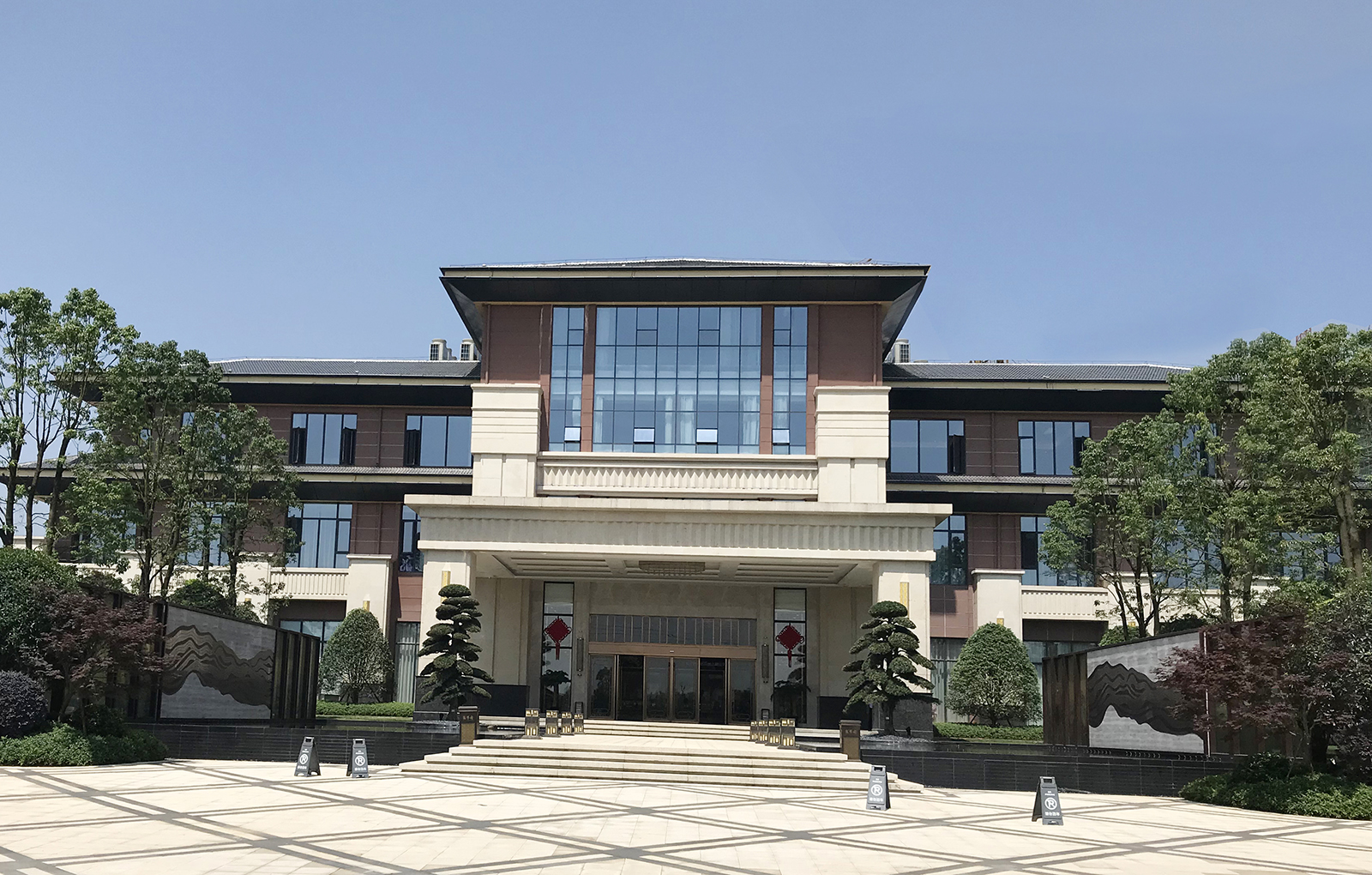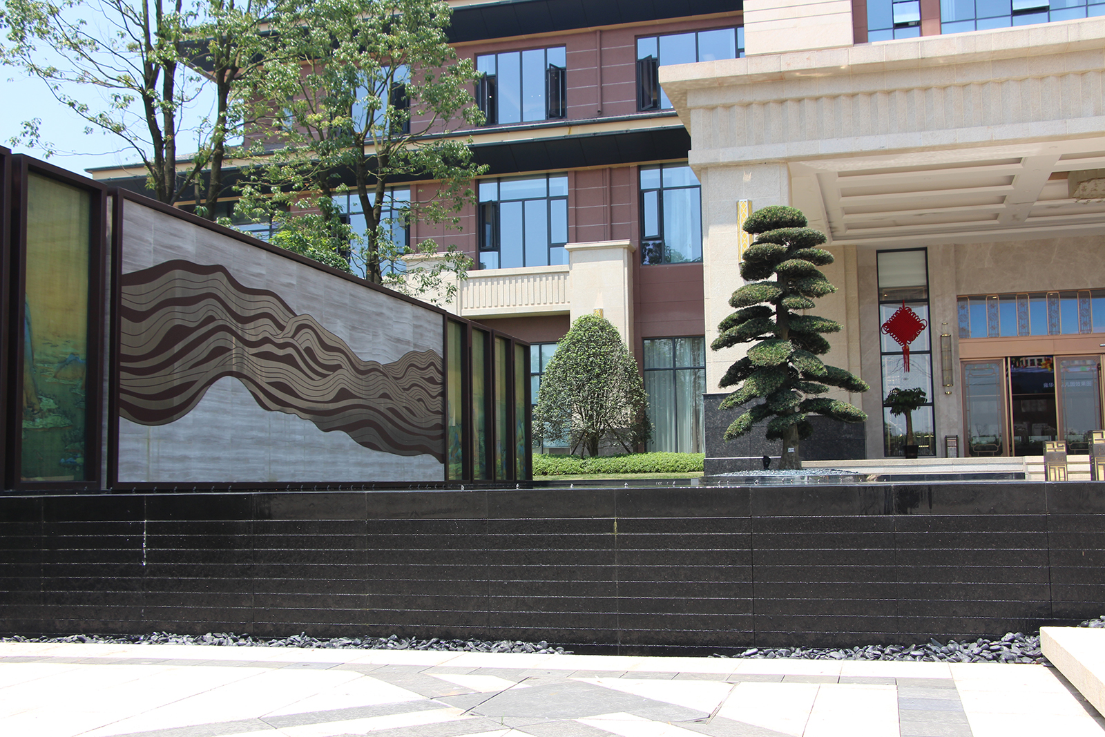 以山水雍華,東方大境為設計主題鏡面水景與絹畫景墻屏風,汲取流經吉安贛江水脈與新干玉華山風景區山脈形制。