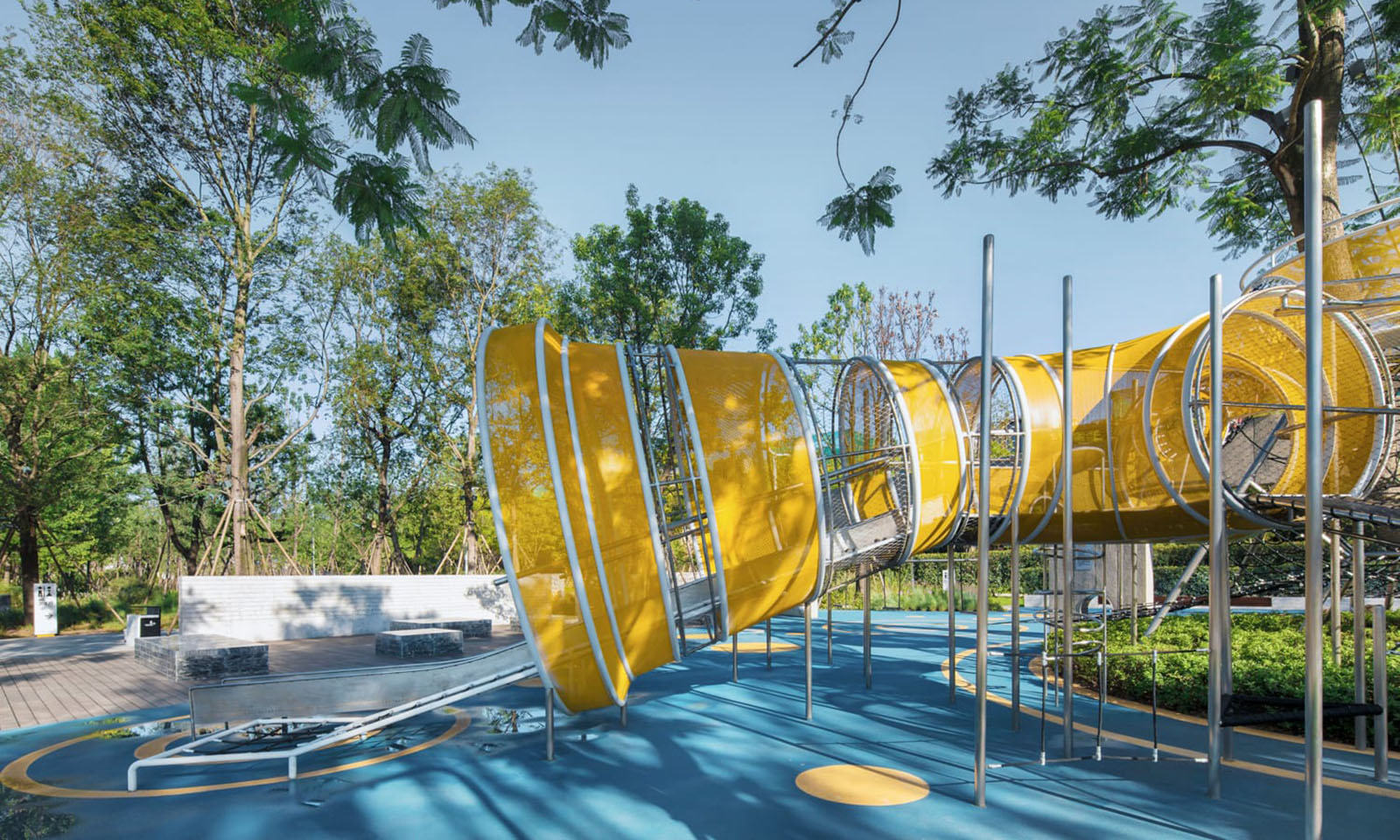 以學齡大童冒險為設計主題,架空的冒險管道、吊橋、方盒子滑梯等設計,激發兒童的探索欲、合作精神、冒險精神。拓展兒童的空間想象力。同時林蔭大樹與器械相結合,探險空間猶如穿梭、浮空在林中,兒童伸手能觸碰到大樹的枝條,更加增強了兒童與自然的互動。