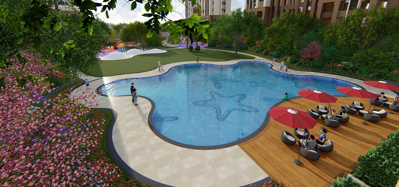 將海星形態衍化成兒童主題戲水池,池底海星馬賽克鋪裝為兒童講述海星在海洋中茁壯成長的趣味旅程。