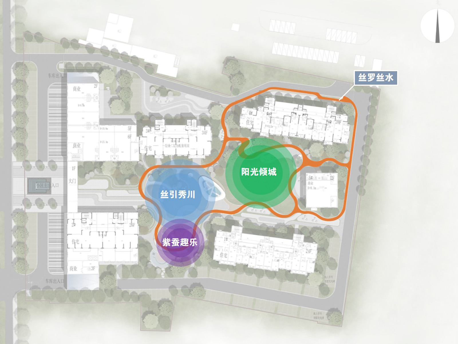 以環繞式的設計手法,梳理鏡面水系脈絡,多層絲纏繞、絞合、牽連,往復不斷,讓觀者在社區中感受心靈的溫養,