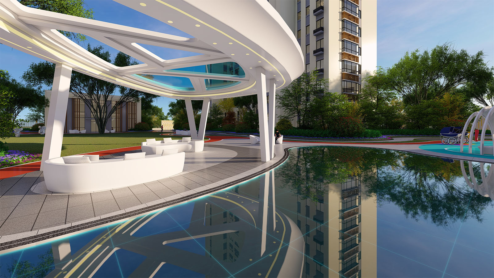 優雅靈動的線型、簡潔純凈的色彩語言,富有韻律的構圖和曲線形式,表達各生活功能區之間相互依纏的空間關系,線條柔和,以曲線構成使的場地更具延展性,采用環繞式的手法體現出溫潤與舒適的人居氛圍。