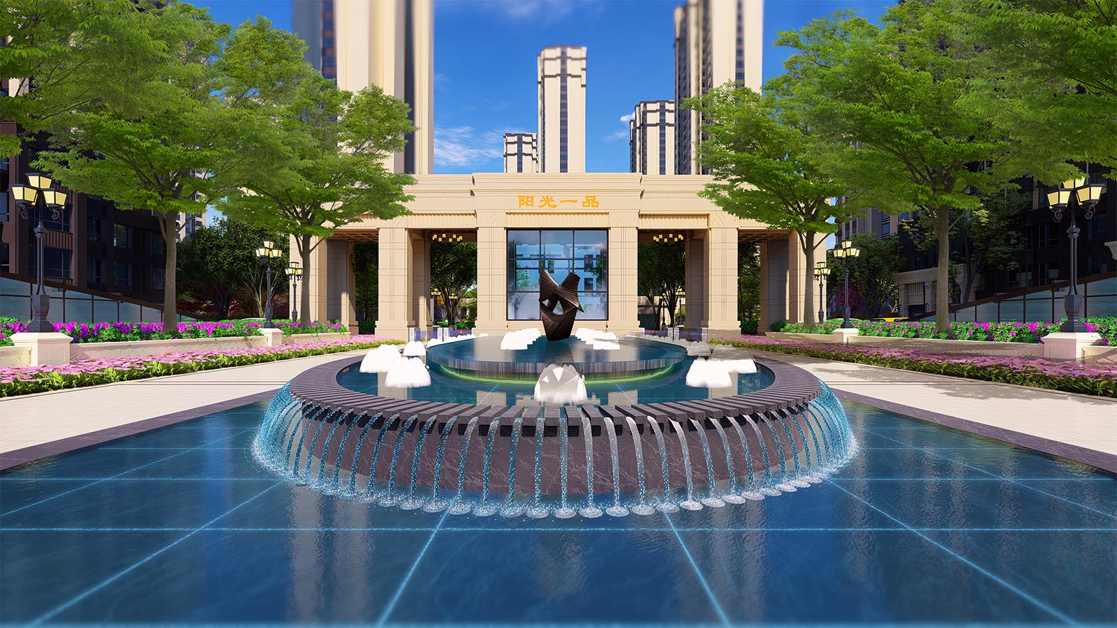 “迎光”主題雕塑概念源于“陽光一品”案名,通過具有張力的具有射線感的紫銅質感的雕塑形態,將迎接業主歸家進入陽光一品的主題借此闡述。