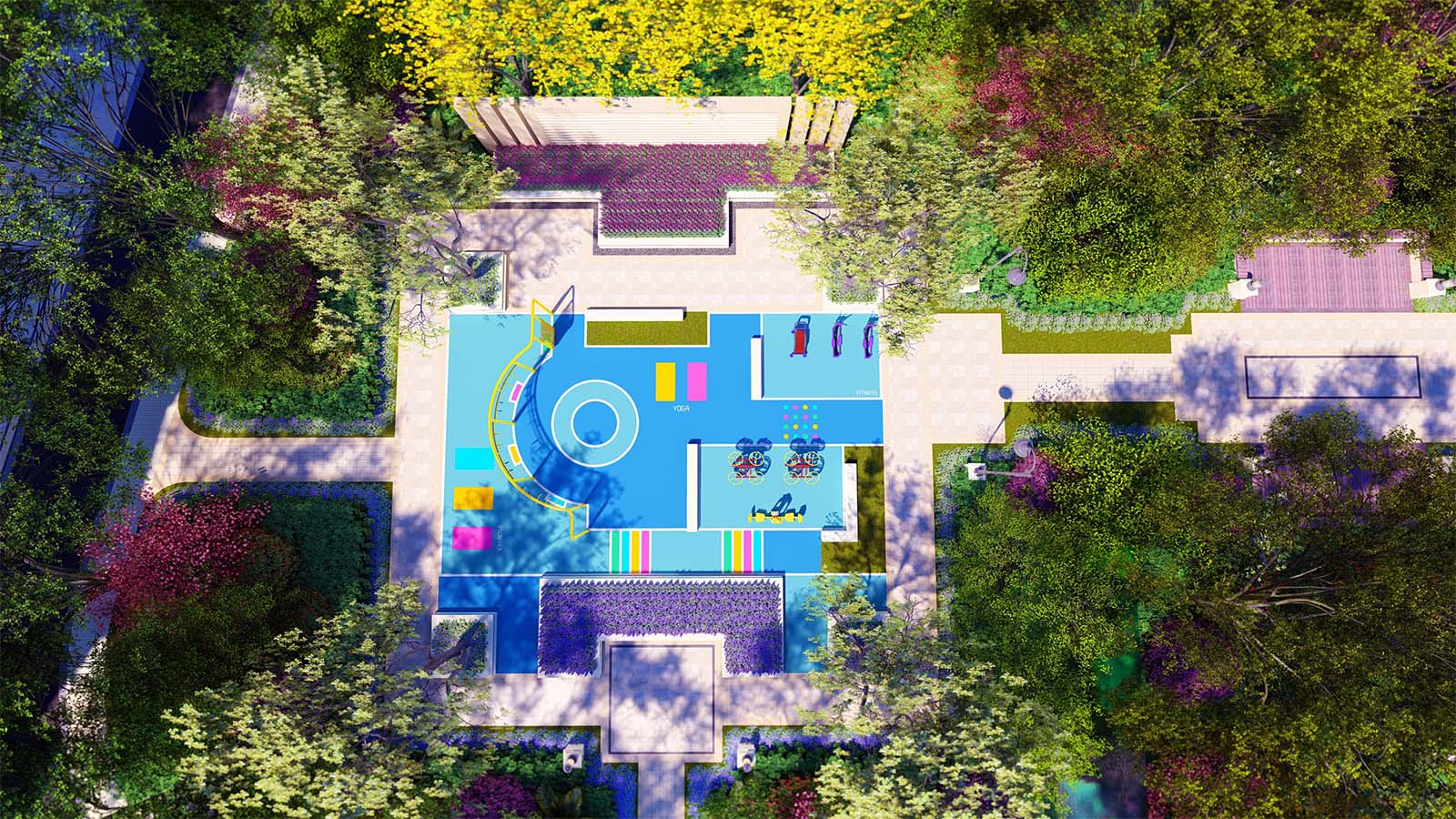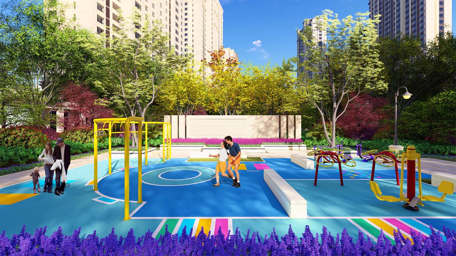 景觀上將其設置在地塊西北隅,降低運動對居民的影響,規劃設計綜合性的多功能成人健身場地,