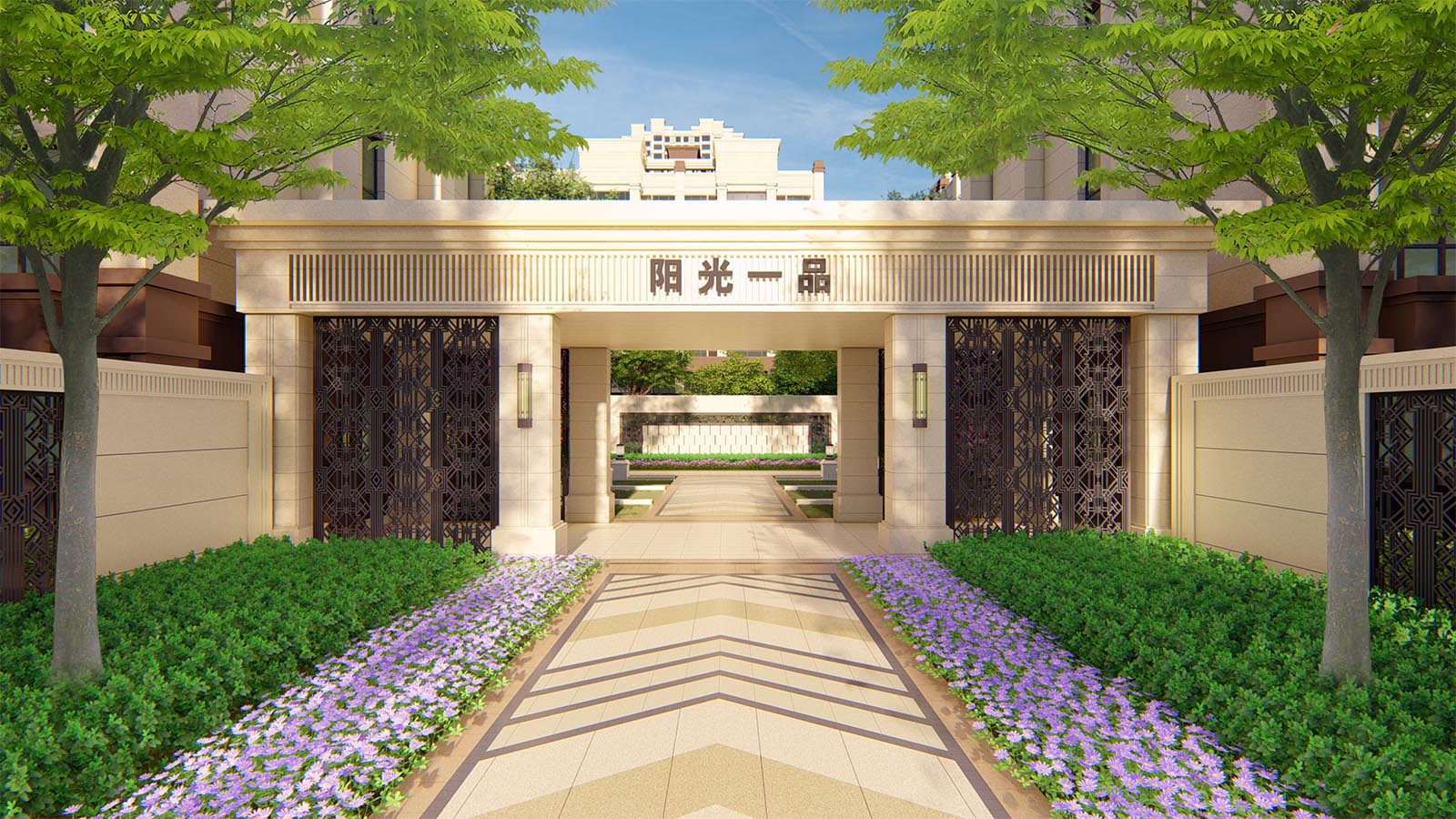 南入口景觀將純粹的古典美學延伸發展,摒棄直白的古典線角的模仿,轉而采用復合現代都會裝飾符號的抽象提煉和現代表達,將雅致與精工匠藝相結合,塑造舒朗、細膩的歸家禮敘。