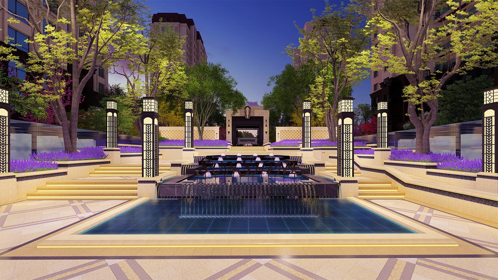 古典的中軸線配合精致的線腳,形式精美又富有力量,前廣場門頭雍容華美,入口對景層層疊疊水景精致動人,引人入勝。