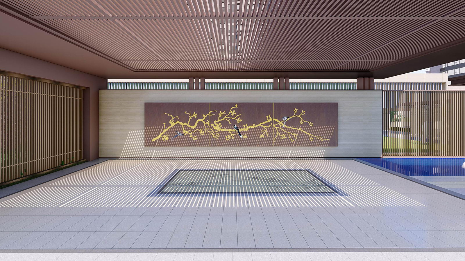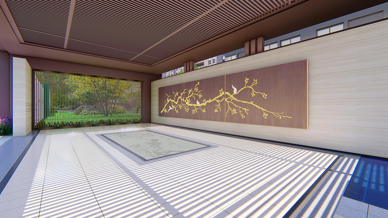 門頭對景處設(shè)置“喜上眉(梅)梢”景墻,客戶視線跟隨梅花枝條方向延伸,巧妙構(gòu)建空間遞進(jìn)關(guān)系,為項(xiàng)目增添趣味及內(nèi)涵。