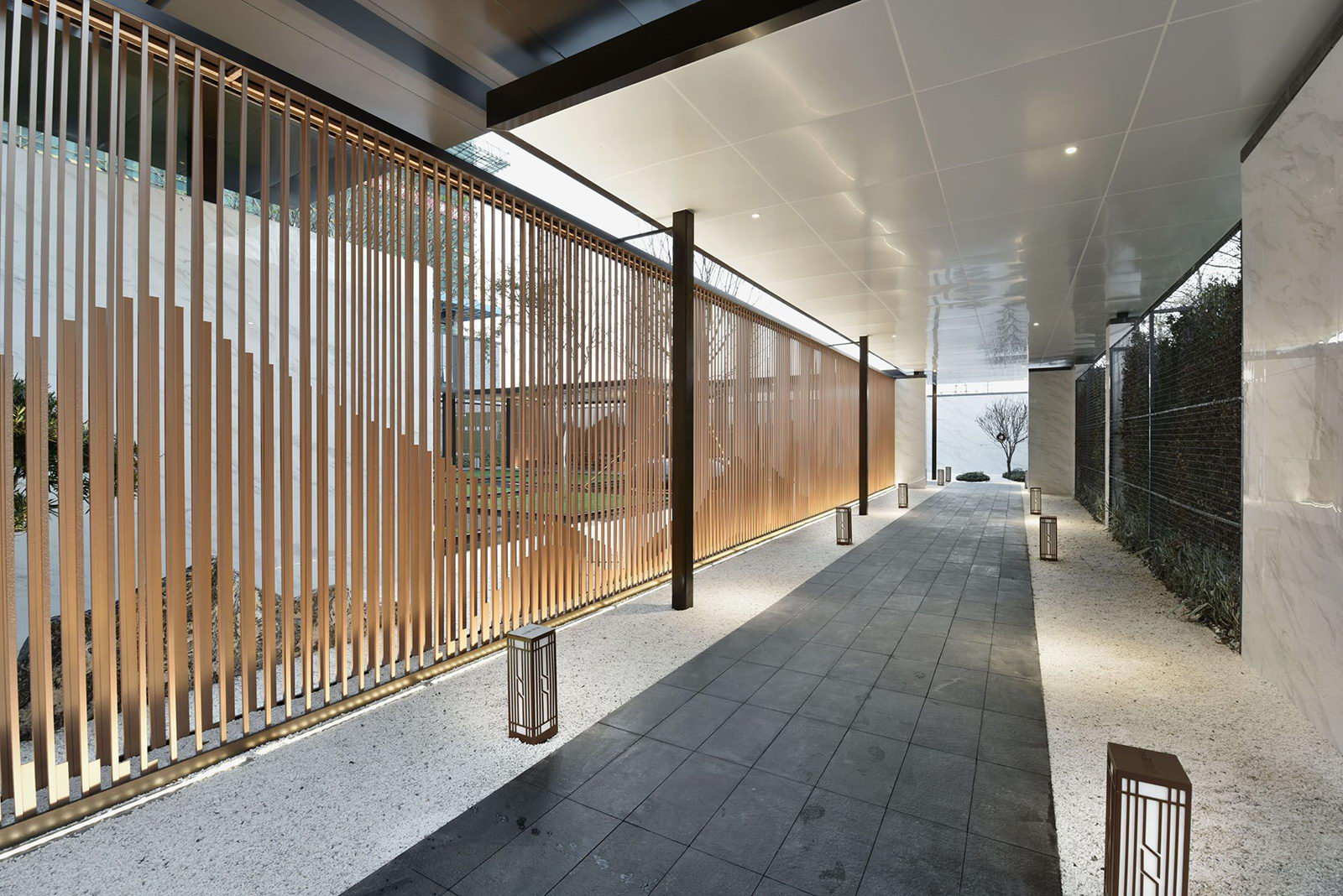 “L形”廊架給予客戶無形的引導(dǎo),帶領(lǐng)客戶進(jìn)入到更深層次空間,廊架頂板布置喜鵲藝術(shù)裝置,以雀幸喜歸為主題,引導(dǎo)賓客進(jìn)入售樓部。