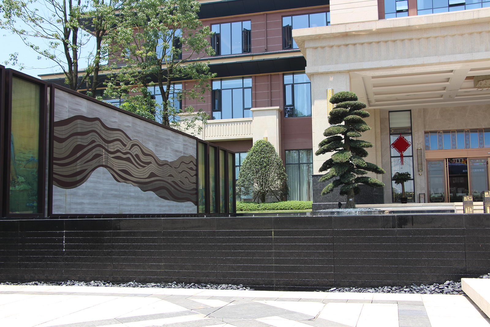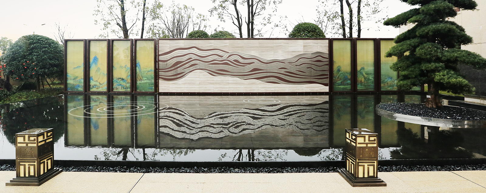 以真絲絹布打印青山綠水長軸,運用現(xiàn)代工藝,將絹畫夾在玻璃中間,中間景墻墻以高端法國木紋為背景,配合鋁板材質雕刻的山脈紋理,結合現(xiàn)代鏡面水景,利用朝夕的光影變化,仿佛古今交映,再現(xiàn)浩瀚江山壯美之境。