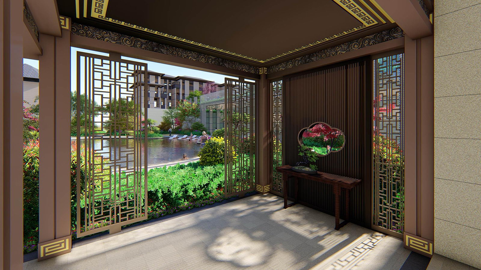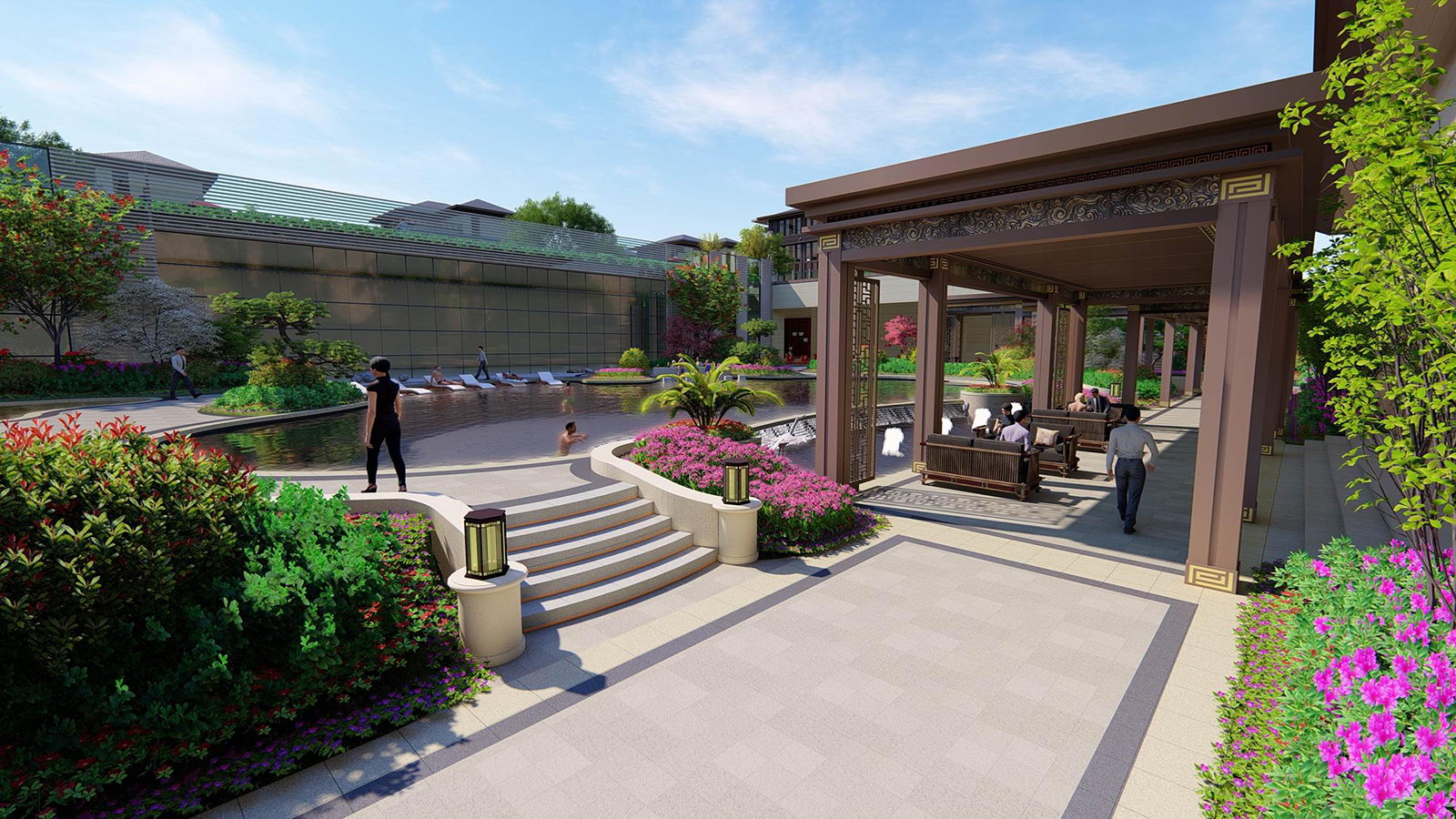 為屋頂花園營造“浮云之上,府院高堂”之意境,一層臺階,一層雍華,不畏浮云遮望眼,只緣身在最高層。屋頂之上四方美景盡收,強調空間與居者的氣度有容乃大,將屋頂有限空間放大到極致,所有豎向元素退至邊界,空間與天相呼應,因此陽光草坪設計為矩形,寓意天圓則地方,更加現(xiàn)代、雅致,將空間中心凸顯出來,營造極雅的空間意境。