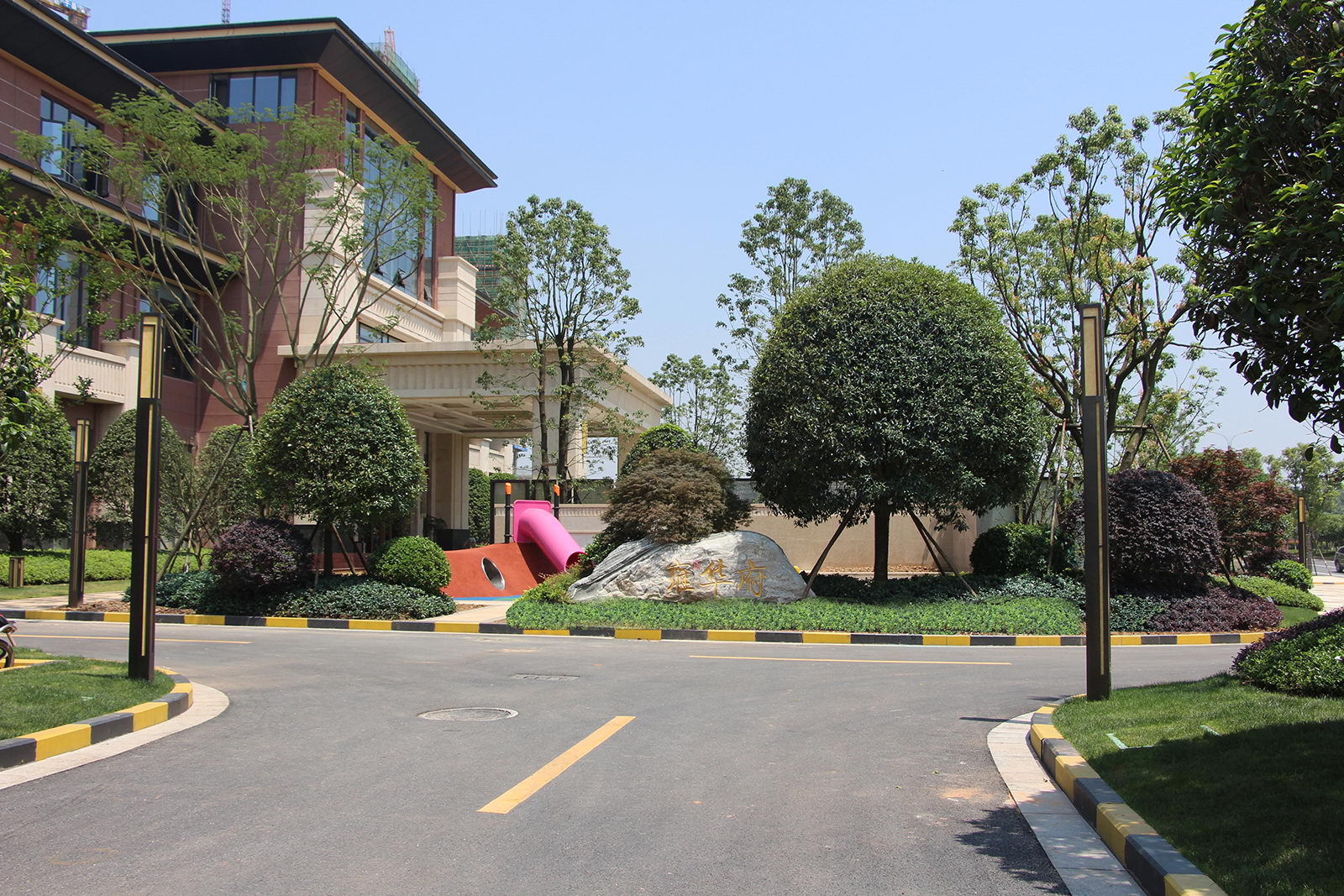 雍華府示范區(qū)前場景觀旨在賦予項目的精神展現(xiàn)力,要求景觀不光把東方人文融入到設計情景之中,而更重要的是,使客戶觸動于泱泱雍華府的寬廣與胸襟,氣魄與神定,為業(yè)主呈現(xiàn)新干最品質、最高端大宅的景觀奏章與禮獻。因此,在設計過程中,避免過于繁復的空間劃分,冗長迂回的流線組織,提倡景觀欲揚則揚,無藏勿抑,開門見山,大氣現(xiàn)世。