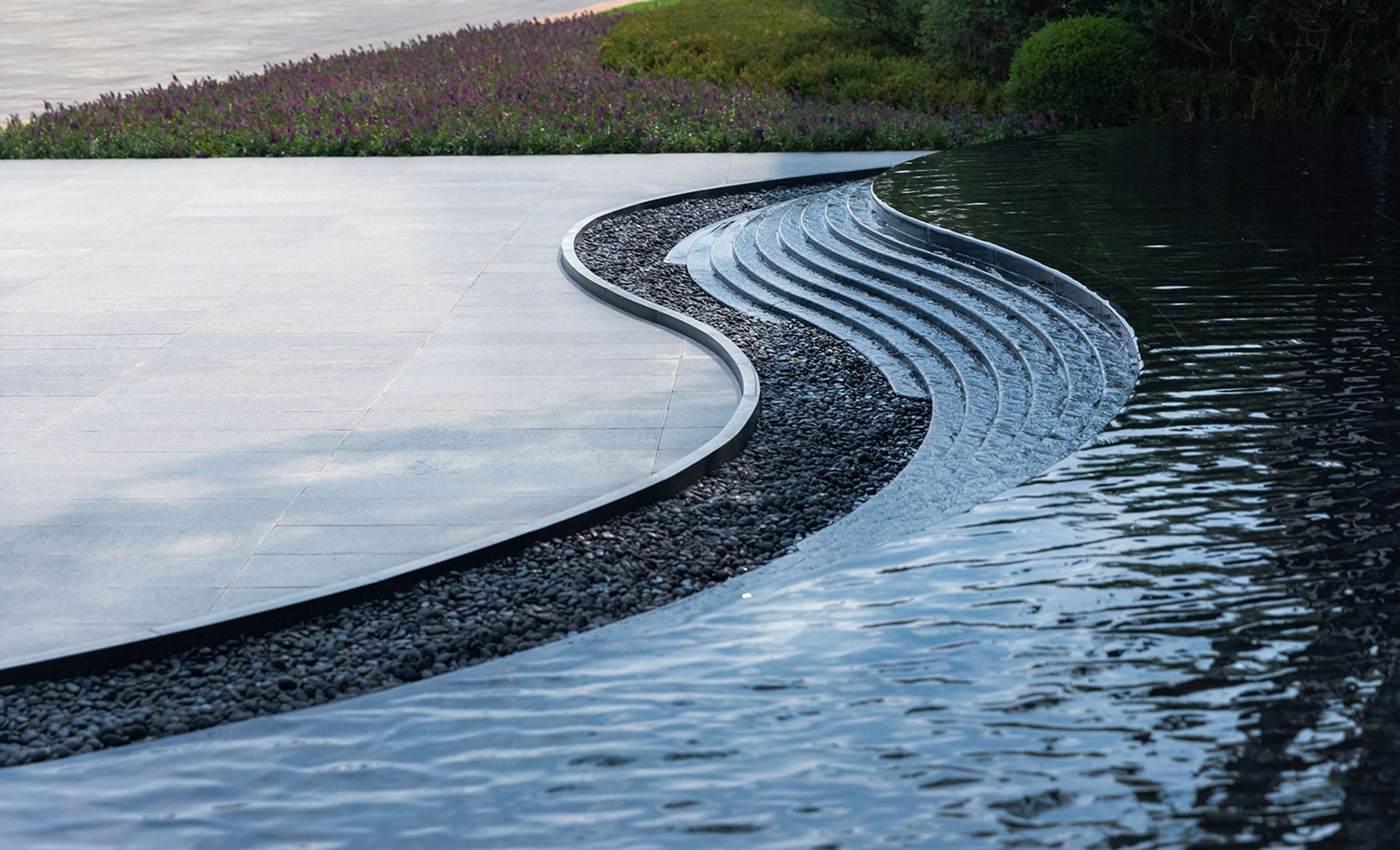 售樓處前場以硯石流墨為視覺焦點,黑色肌理猶如一方硯臺,水景層層疊疊,如水墨輕流,水墨文鋪裝如丹青一抹煙雨濃,墨香氤氳氣韻生,不只是宣紙上走筆才能暈染出水墨的虛幻與自由。