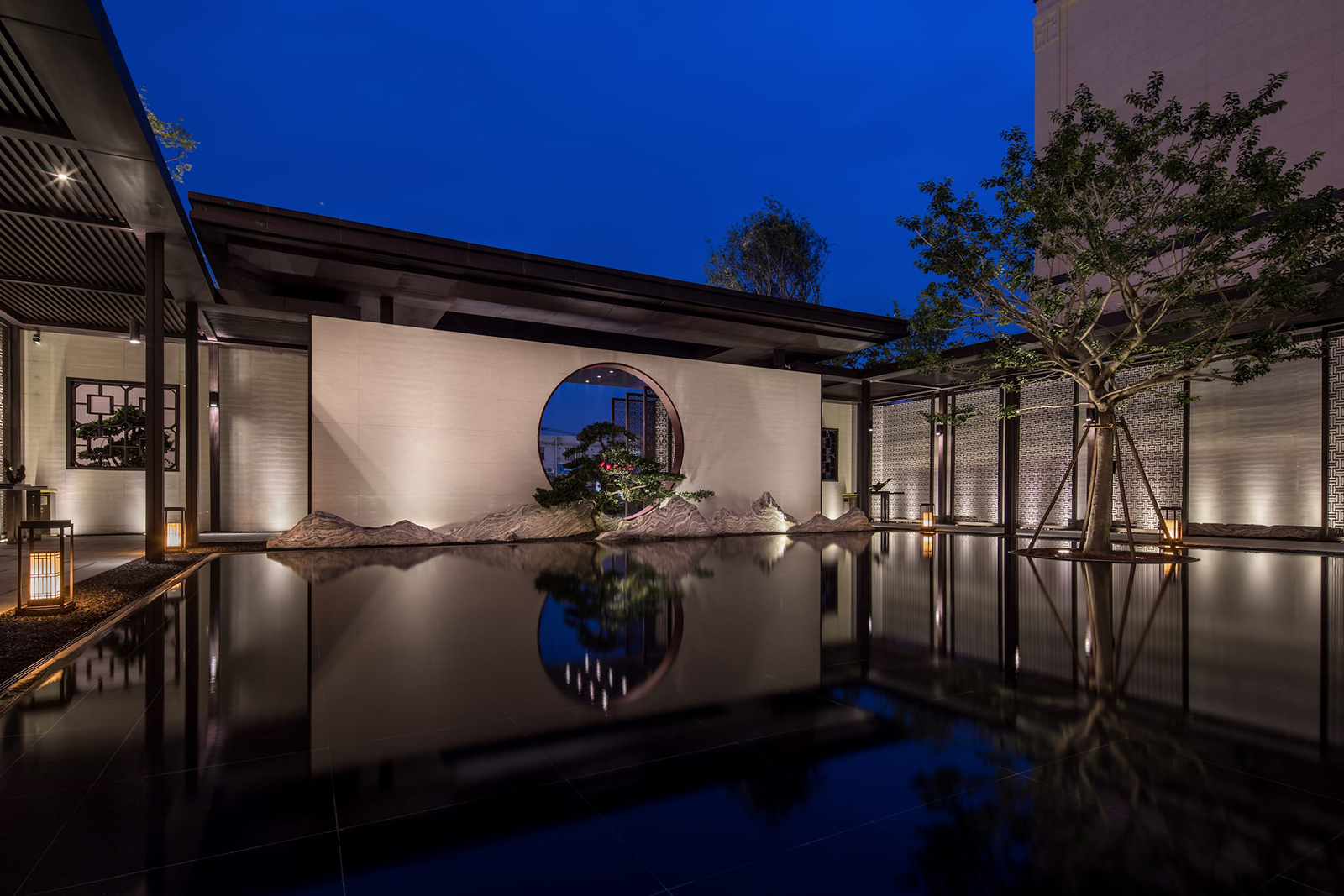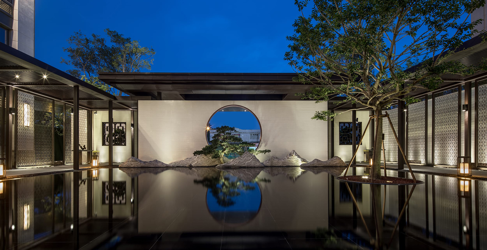 中心水景花園作為中軸核心,東入口向園而行,途徑極具東方雅韻的禪意枯山水,一橋轉(zhuǎn)折入境,借新中式設(shè)計(jì)手法,由虛轉(zhuǎn)實(shí),虛實(shí)絞合,將山水理念融匯其中,鏡水回廊營造水天大境,張弛有度的描繪一幅大氣優(yōu)雅的現(xiàn)代山水畫卷。意境脈絡(luò)從西入口至中園同樣的上演:穿過屏風(fēng)、月洞景墻,藏著一片唯美山水畫境:水廊鏡天、松石浮玉皆歸此園。不分遠(yuǎn)近,不知高下,月洞之后,更像一個故意的偶然,一點(diǎn)點(diǎn)構(gòu)建游園的驚喜。