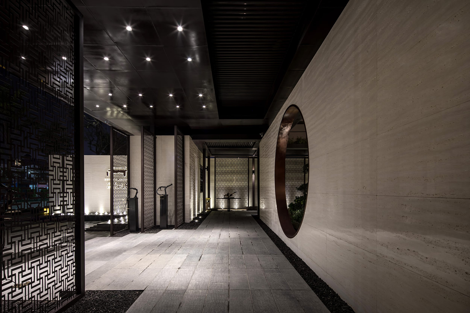居者歸家,表現(xiàn)一個府系主題的入口,通常是厚重的。若想舉重若輕的傳達(dá)府園的高貴感,文化意境的融入和儀式感的空間轉(zhuǎn)換應(yīng)不可或缺。